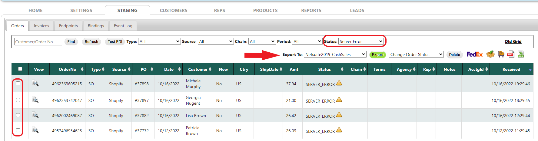 Change the filter to Match Customer to locate the orders. Then match the customer using the name to an existing account. If you need to create new accounts, contact support because the configuration will need to be adjusted. If the order does not need a new account, match the customer and export.