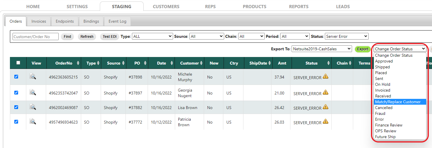 - Change the order Status to MATCH_CUST from the Status dropdown.